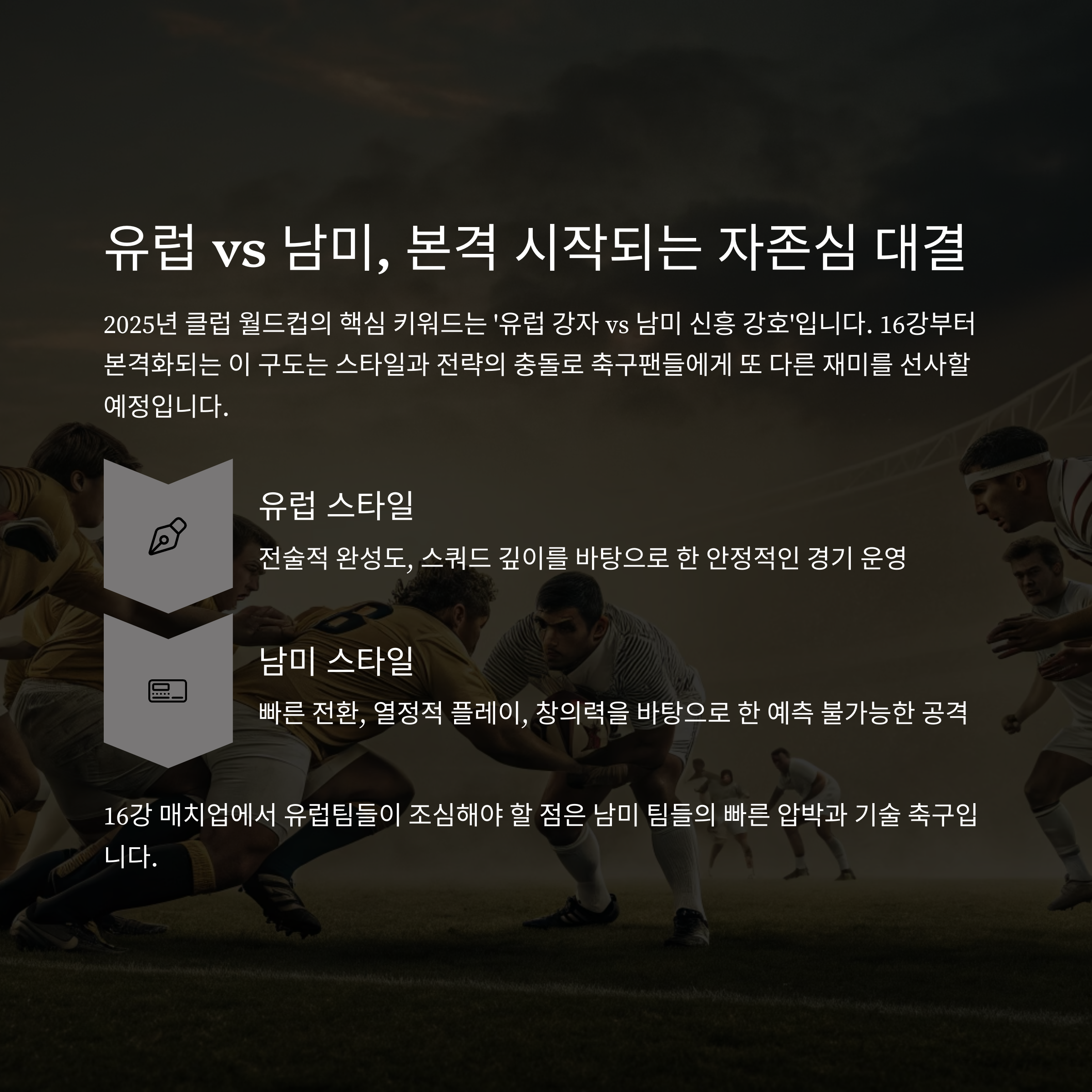 16강 매치업에서 유럽팀들이 조심해야 할 점은 남미 팀들의 빠른 압박과 기술 축구입니다.