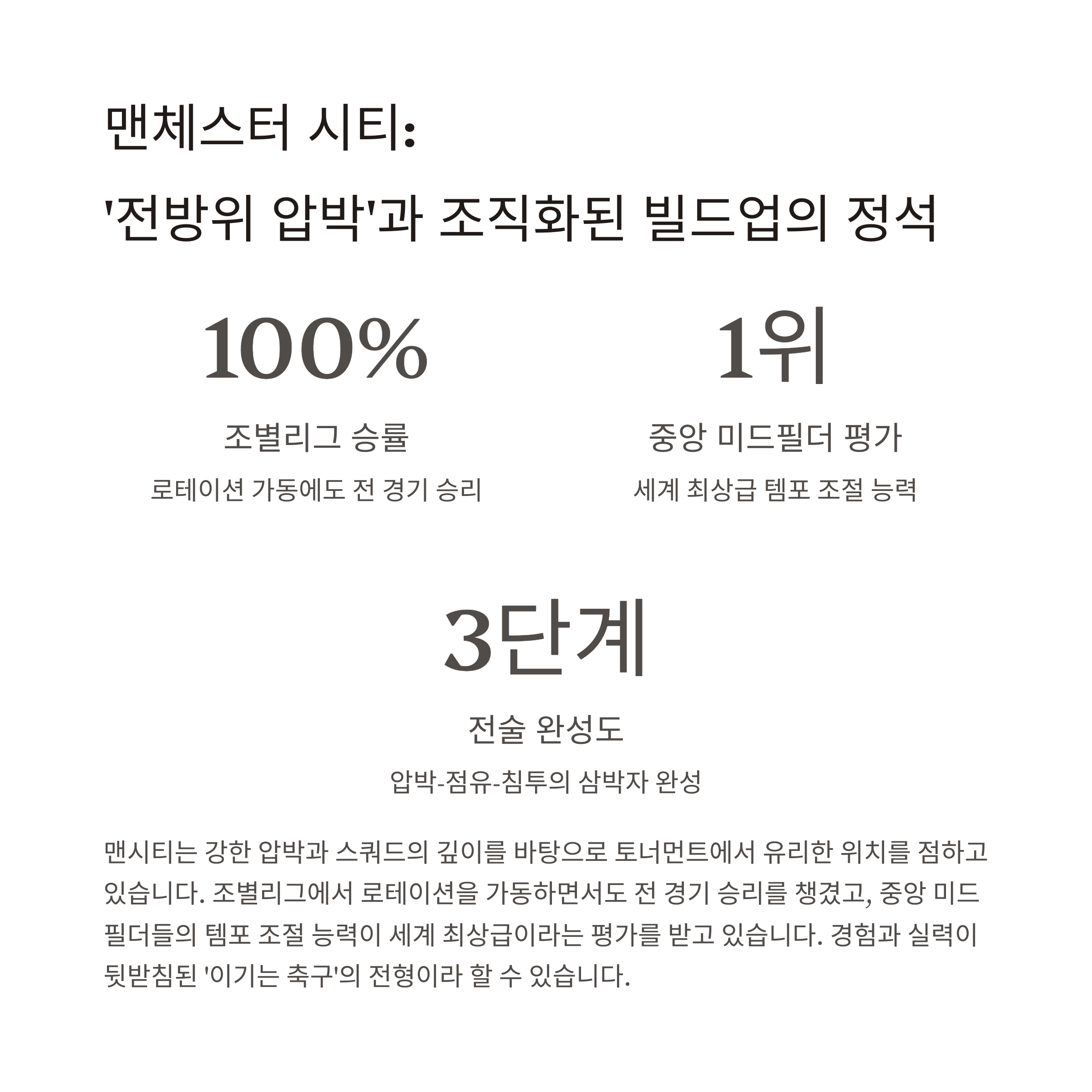 | 전술 | 압박-점유-침투의 삼박자 완성 |