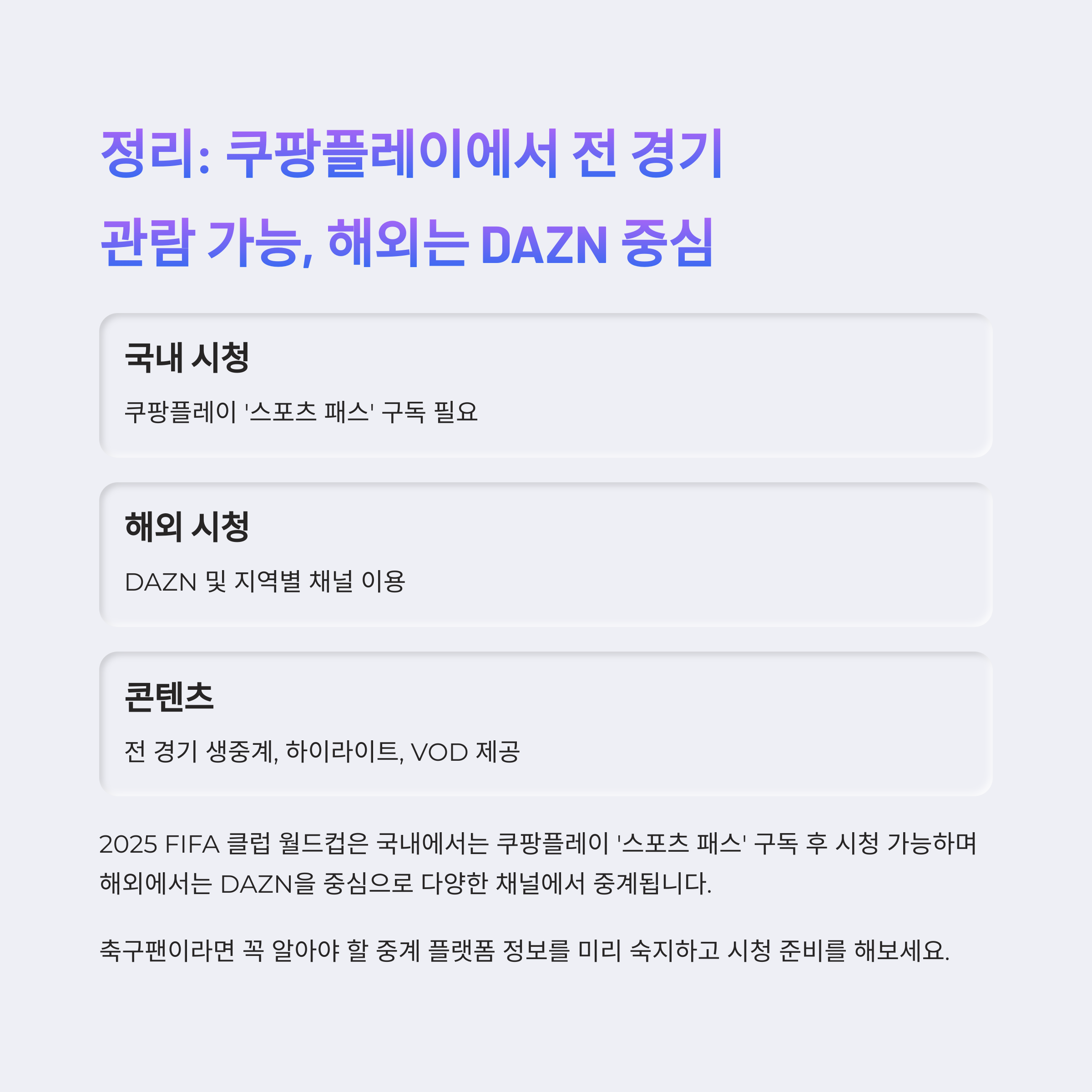 2025년 FIFA 클럽 월드컵은 기존 국가대표 월드컵과는 달리, 전 세계 32개 클럽이 출전하는 새로운 형식의 대회입니다. 이번 대회의 국내 공식 중계는 쿠팡플레이가 맡으며, 유료 서비스인 ‘스포츠 패스’를 통해 전 경기를 생중계합니다. 축구 팬이라면 관심이 높을 수밖에 없는 이 대회를 어떻게, 어디서, 어떤 방식으로 시청할 수 있는지 지금부터 자세히 안내드립니다.