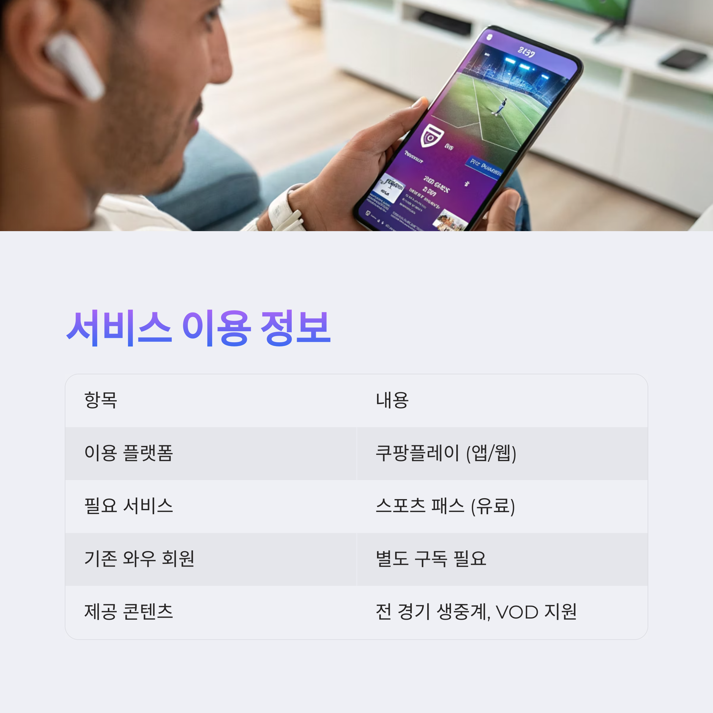 - 주요 특징: 실시간 중계, 고화질 시청, 모바일·PC 동시 가능