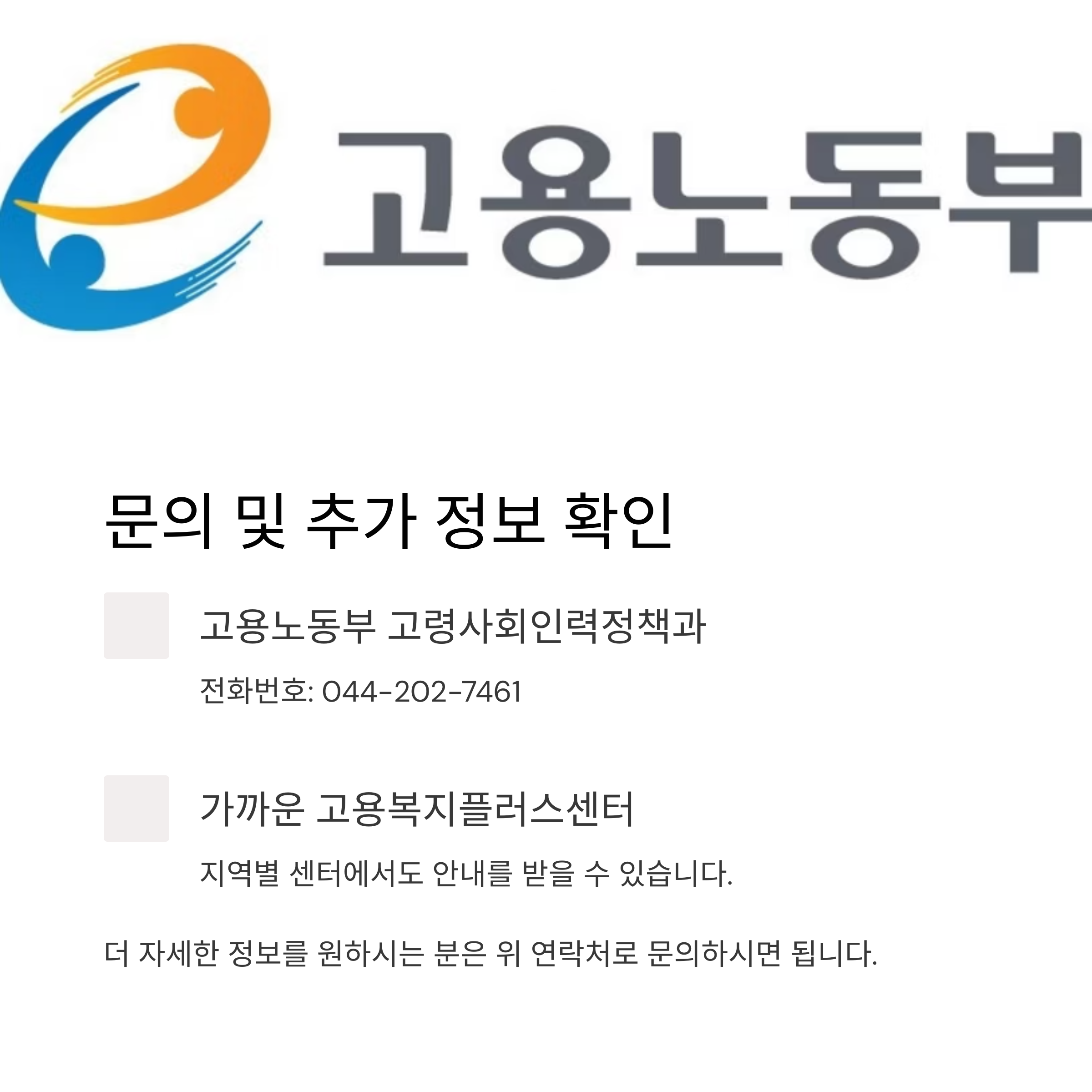 더 자세한 정보를 원하시는 분은 고용노동부 고령사회인력정책과로 문의하시면 됩니다.