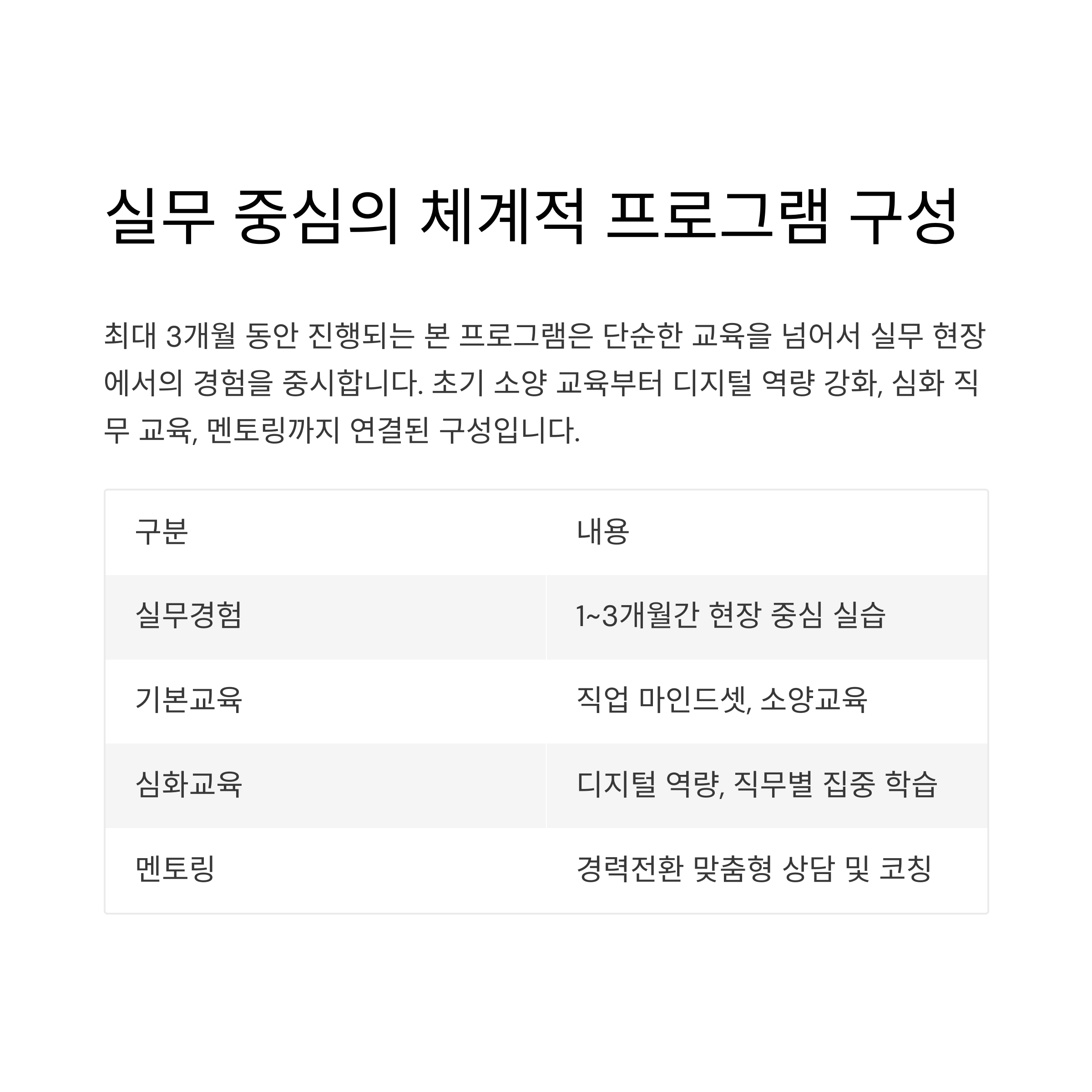 | 실무경험 | 1~3개월간 현장 중심 실습 |
