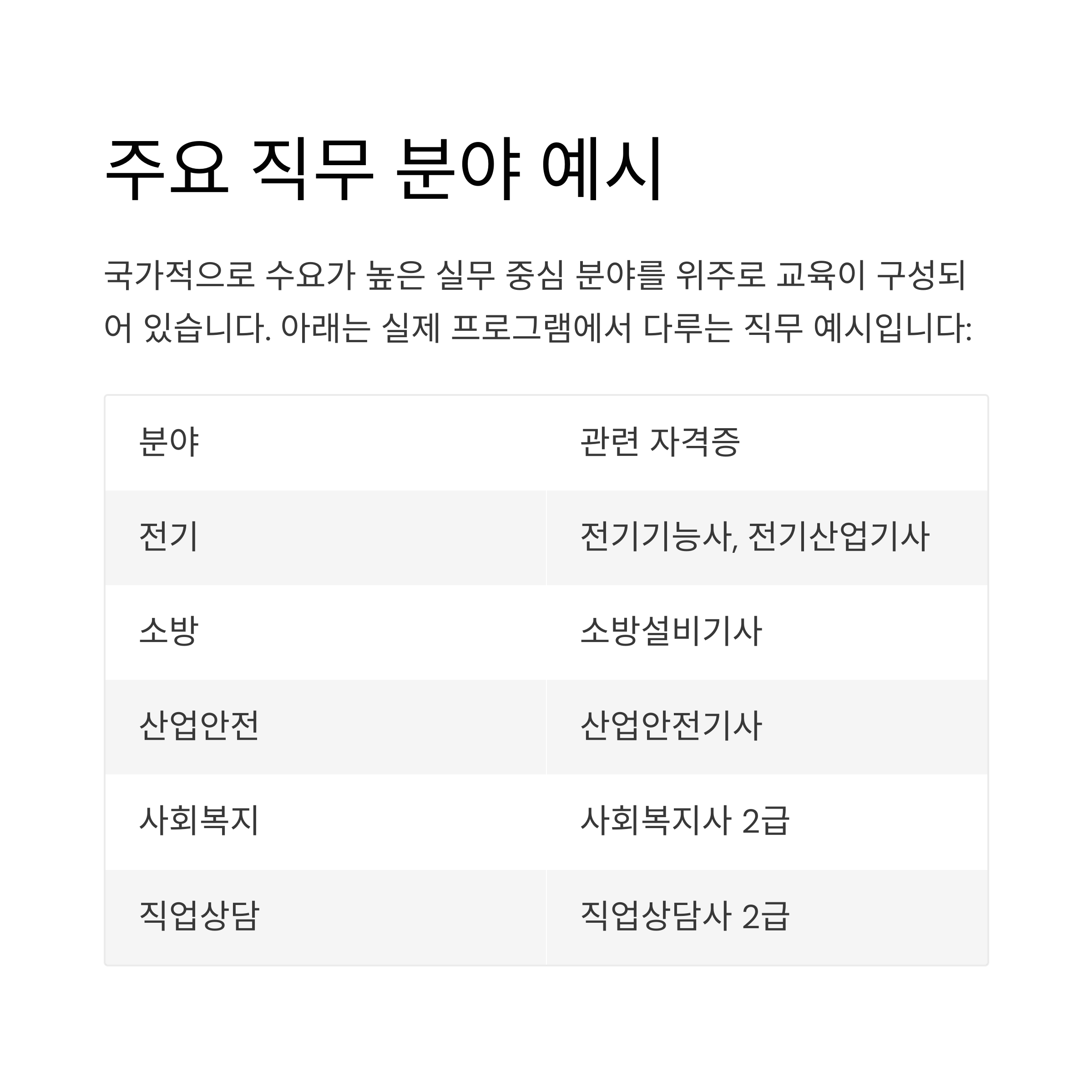 국가적으로 수요가 높은 실무 중심 분야를 위주로 교육이 구성되어 있습니다.