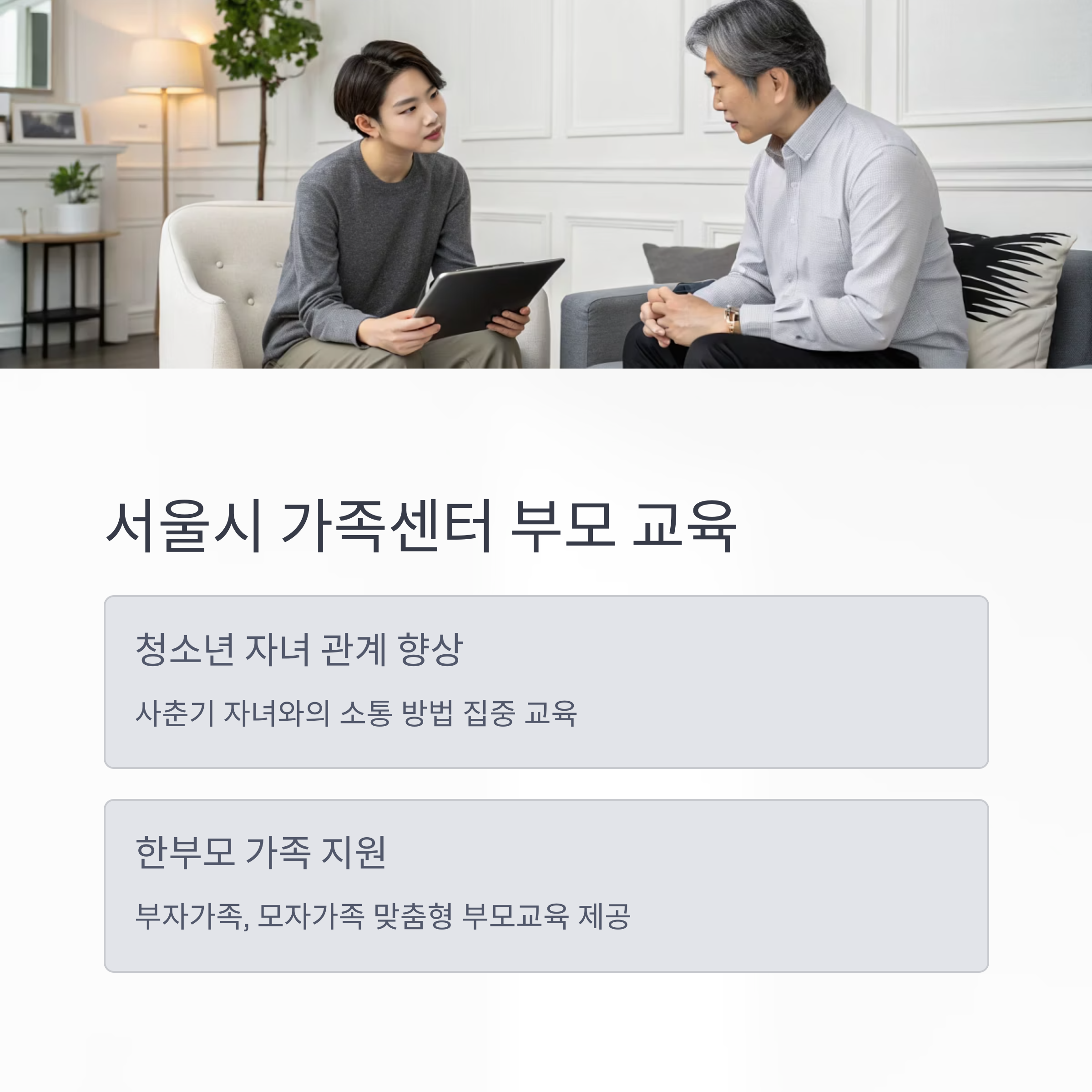 서울시에서는 한부모 가족을 위한 다양한 부모 교육 프로그램을 제공하고 있습니다. '청소년 자녀와의 관계 향상', '부자가족 부모교육', '모자가족 부모교육' 등 다양한 주제의 프로그램을 통해 부모님들이 자녀와의 소통 능력을 향상시킬 수 있습니다.