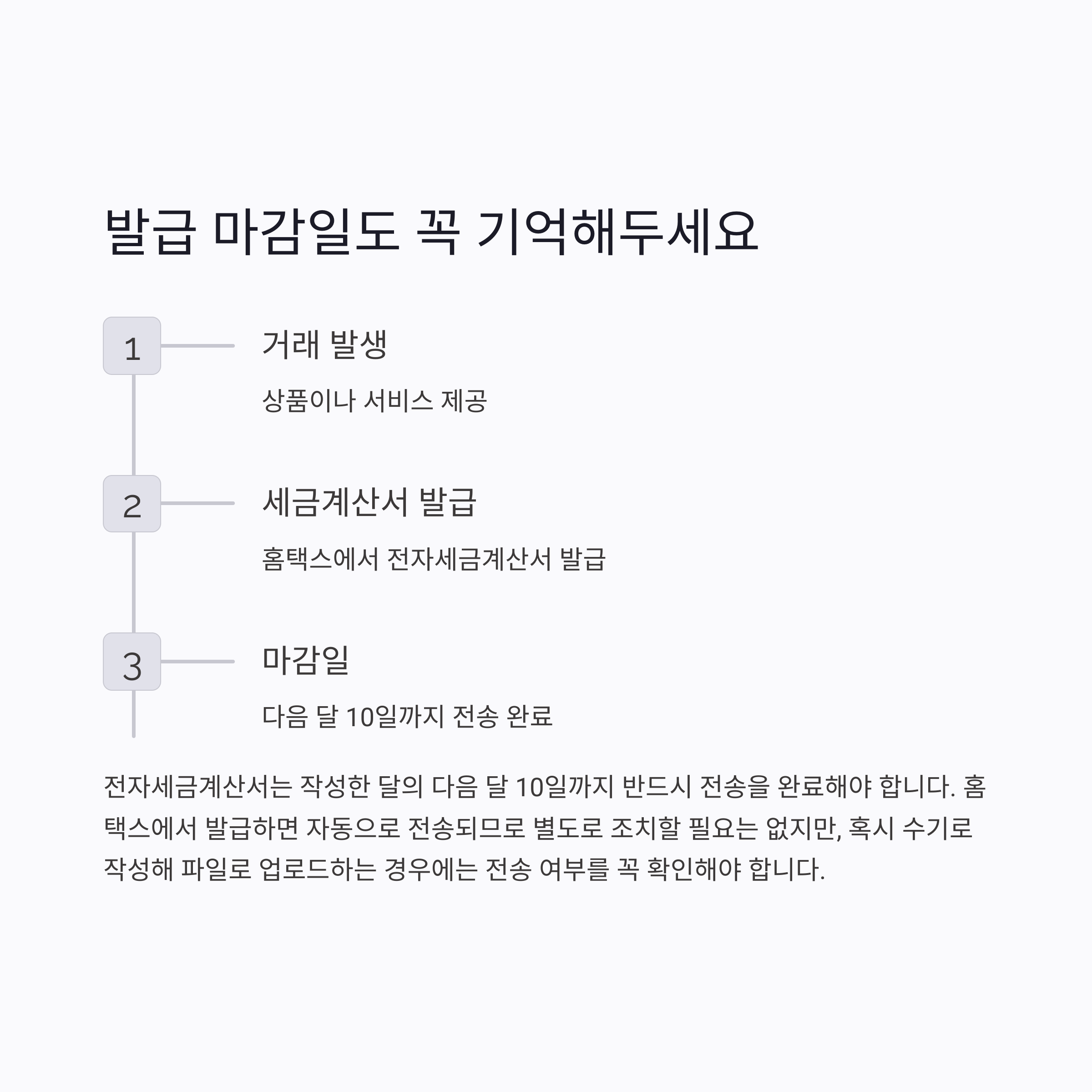 홈택스를 통해 직접 발급하면 국세청에 자동 신고되고 거래처에도 즉시 전달되어 매우 편리합니다.