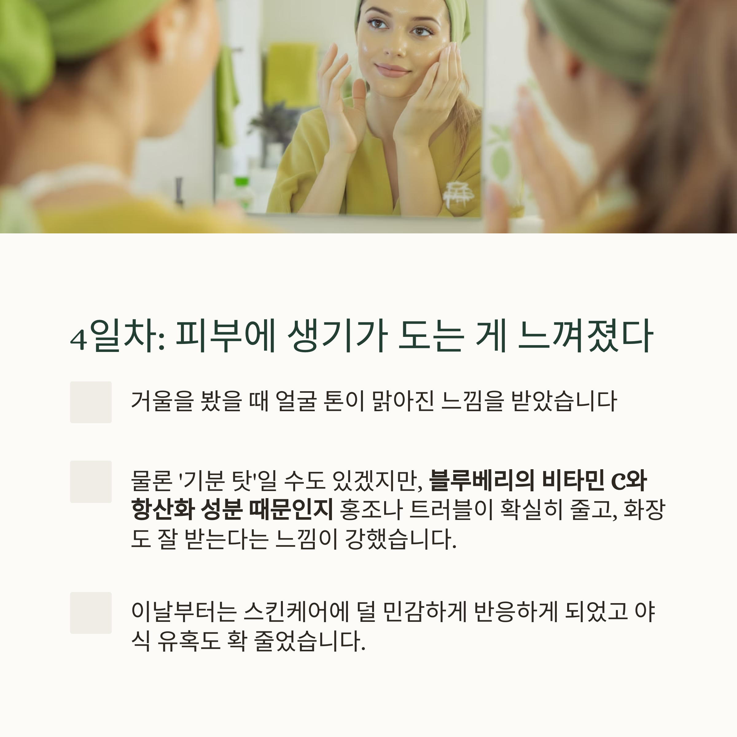 | 4~5일차 | 피부 상태 개선 | 생기 & 트러블 감소 |