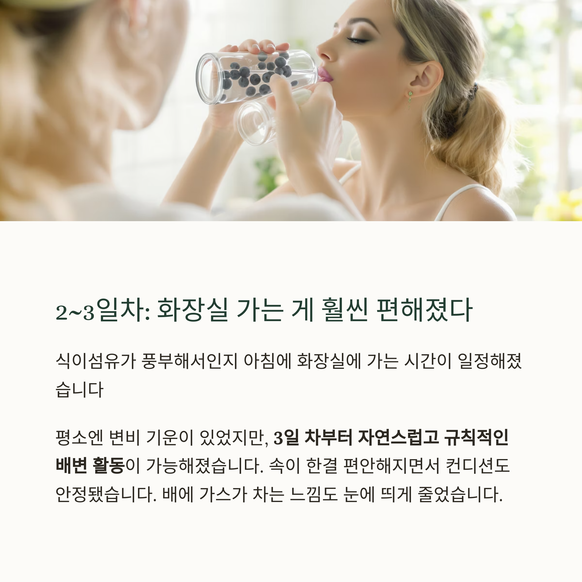 평소엔 변비 기운이 있었지만, 3일 차부터 자연스럽고 규칙적인 배변 활동이 가능해졌습니다.