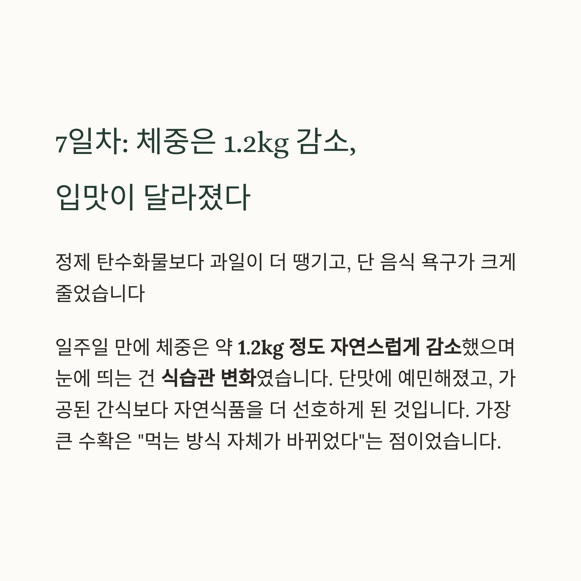 | 7일차 | 체중 1.2kg 감량 | 입맛 변화, 식욕 억제 |