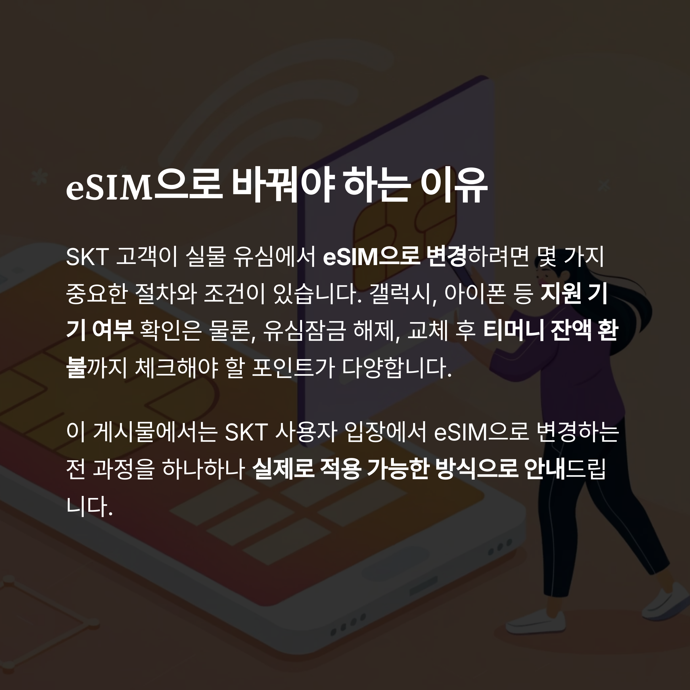SKT 고객이 실물 유심에서 eSIM으로 변경하려면 몇 가지 중요한 절차와 조건이 있습니다.