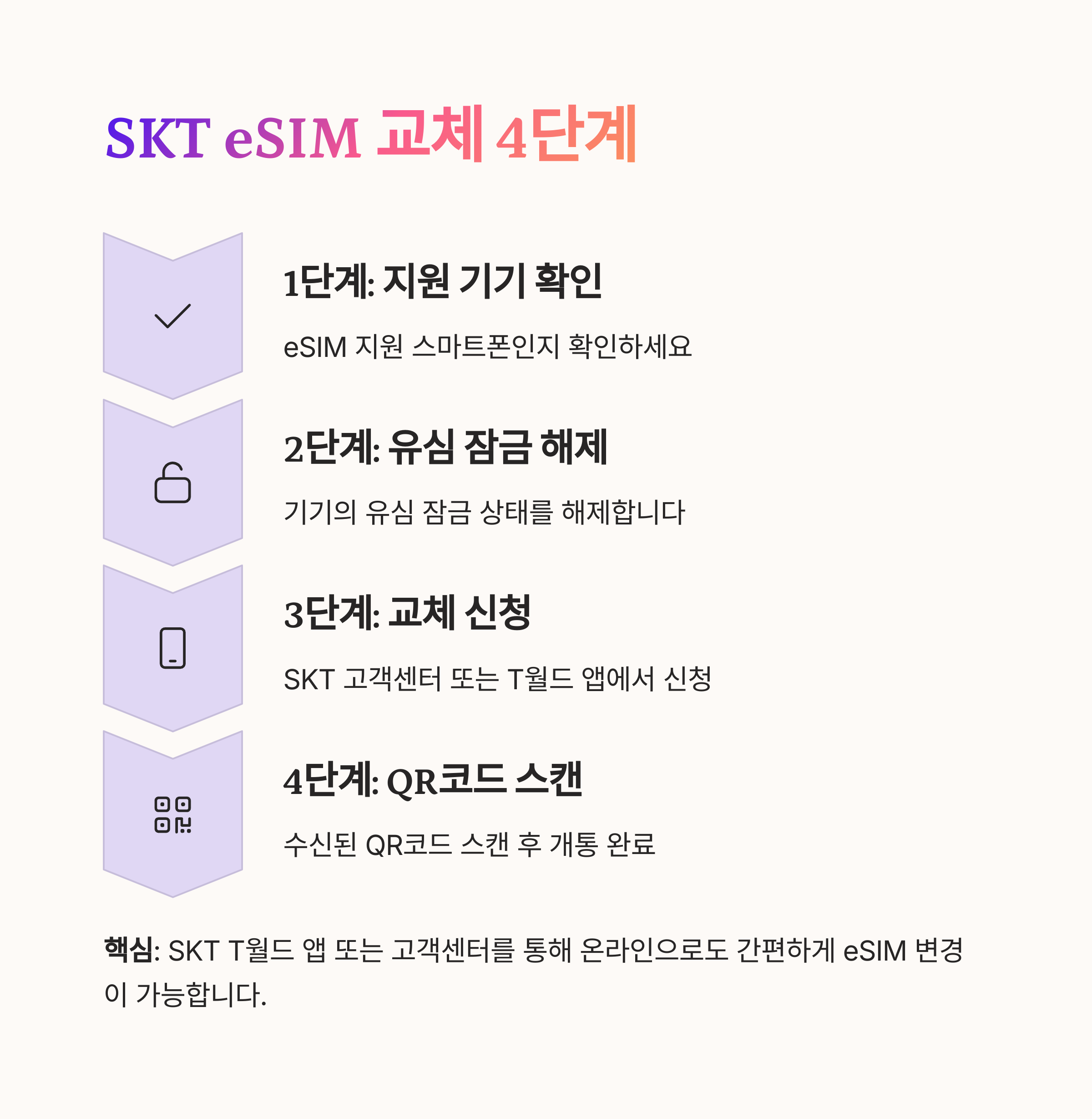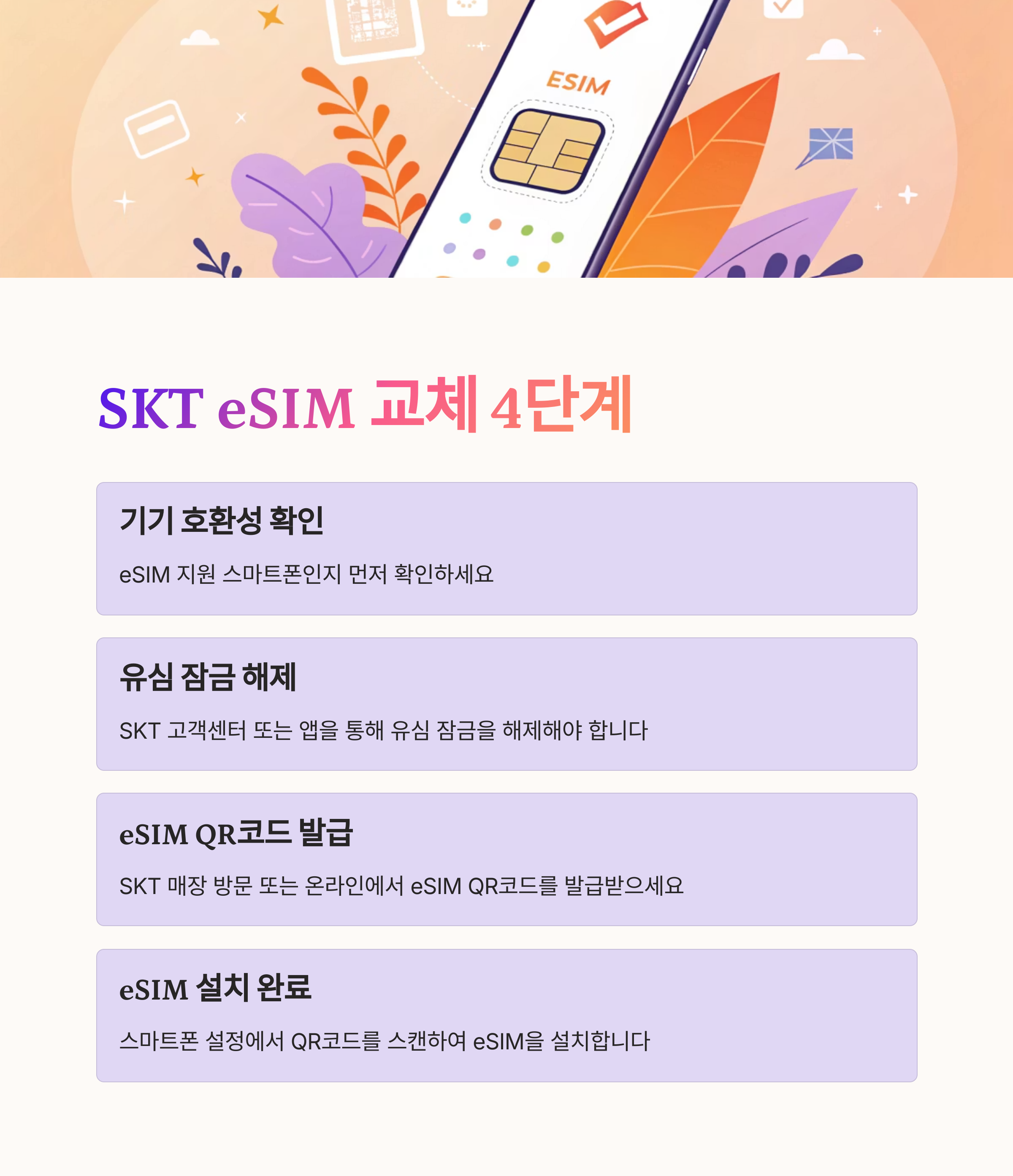 핵심: SKT T월드 앱 또는 고객센터를 통해 온라인으로도 간편하게 eSIM 변경이 가능합니다.